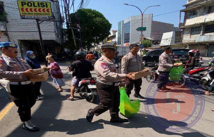 Kapolsek Simokerto, Kompol Mohammad Irfan, bersama Pawas Iptu Dwi Kanit Lantas dan anggotanya turun tangan langsung membagikan nasi kotak kepada warga yang melintas.