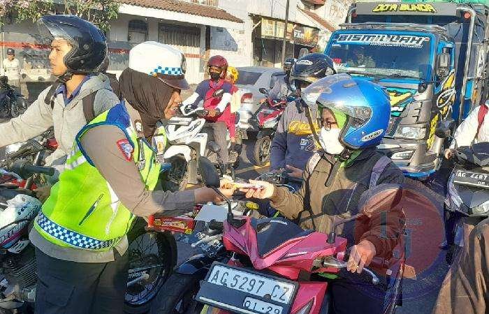 Polisi pun menggunakan cara unik untuk mengedukasi pengendara,salah satunya dengan membagikan kue coklat untuk pengendara yang tertib berlalu lintas yang melintas di Jl Mayor Bismo Kota Kediri, Jum’at (19/7/2024).