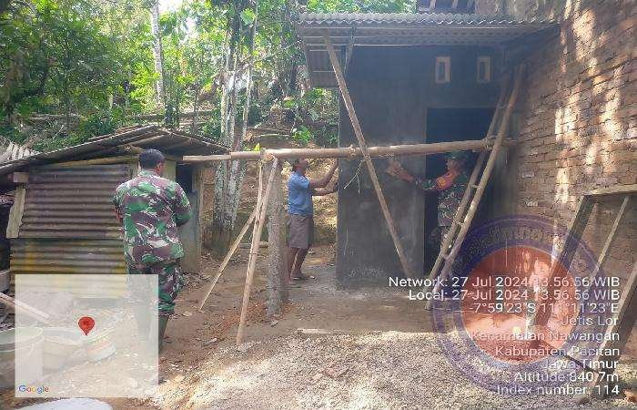 Saat Babinsa Koramil 0801/05 Nawangan, Kodim 0801/Pacitan, Sertu Suryanto bersama masyarakat bergotong-royong melakukan pengedropan bahan material berupa batako dan pasir untuk pembangunan program Jambanisasi di wilayah Kecamatan Nawangan, Kabupaten Pacitan, Jawa Timur.