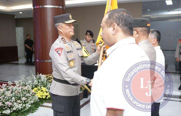 SURABAYA lintasjatimnews – Kapolda Jawa Timur Irjen Pol. Imam Sugianto bersama Pejabat Utama (PJU) Polda Jatim melaksanakan upacara pengukuhan struktur organisasi dan susunan pengurus Komite Olahraga Polri (KOP), di Lobby Gedung Patuh, Mapolda Jatim, Rabu (31/7/24).