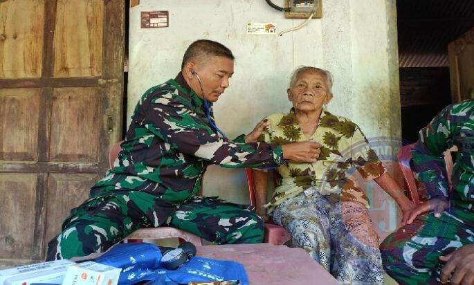 Oleh Serma Miseni (anggota Tim Medis Satgas TMMD ke 121) dari Poskes 05.09.05 Ponorogo memberikan pelayanan kesehatan berupa pemeriksaan dan pemberian obat kepada Mbah Paikem dengan penuh kesabaran dan telaten.