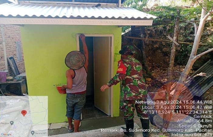 PACITAN lintasjatimnews – Optimalkan program jambanisasi, Babinsa Koramil 0801/09 Sudimoro Kodim 0801/Pacitan Kopda Erik membantu Pembangunan Jamban Sehat, di desa binaanya.