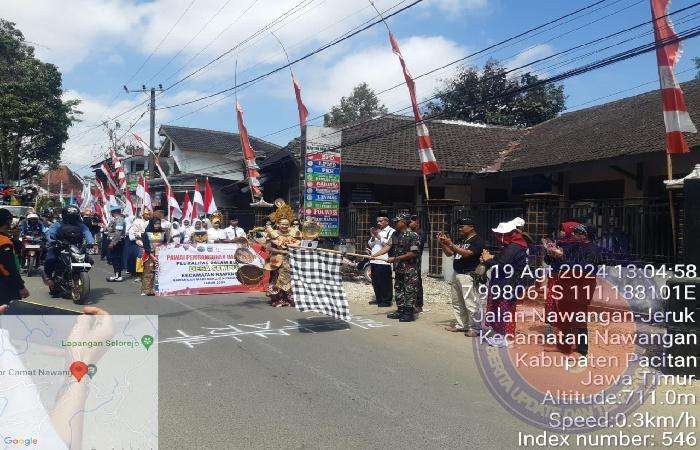 PACITAN lintasjatimnews – Kali ini dalam Rangka Memeriahkan HUT RI Ke-79 Danramil 0801/05 Nawangan Kodim 0801/Pacitan Lettu Arh Gino didampingi beberapa personel Babinsa monitoring kegiatan pawai pembangunan bertempat di Halaman Pendopo kecamatan Nawangan Kabupaten Pacitan. Senin (19/08/2024).