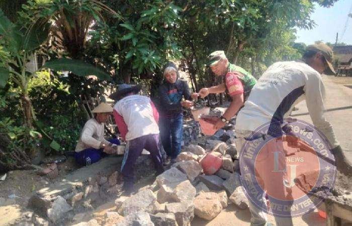 Dalam kegiatan gotong royong tersebut, Babinsa dan warga bekerja sama membangun talud jalan menggunakan batu dan semen. Mereka bekerja keras dan saling membantu satu sama lain.