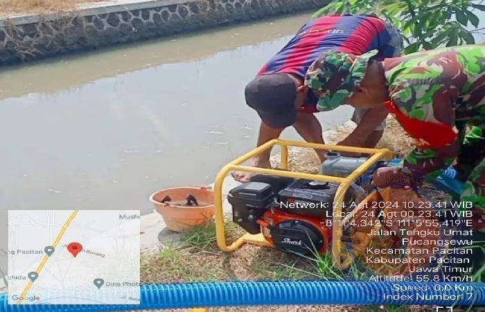 PACITAN lintasjatimnews – Untuk membantu petani dalam mencapai swasembada pangan di wilayah binaan, Babinsa Koramil 0801/01 Pacitan Kodim 0801/Pacitan Koptu Fidriyanto turun mendampingi dan membantu pengairan lahan persawahan dengan pompanisasi/pengairan sawah milik bapak Agus Pletuk dari Poktan Karyo di wilayah Kelurahan Pucangsewu Kecamatan Pacitan Kabupaten Pacitan. Jumat (23/08/2024).