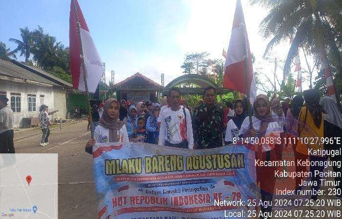 PACITAN lintasjatimnews – Babinsa Koramil 0801/02 Kebonagung Kodim 0801/Pacitan Serda hendrik pagi ini menghadiri acara dalam rangka memeriahkan hari kemerdekaan Indonesia yang ke 79 Tahun 2024, Pemerintah Desa Klesem bertempat di lapangan Desa Klesem Kecamatan Kebonagung Kabupaten Pacitan, saat ini laksanakan jalan sehat. Selain jalan sehat ada beberapa agenda lomba lomba seperti ngubek balong dan lomba lainya.