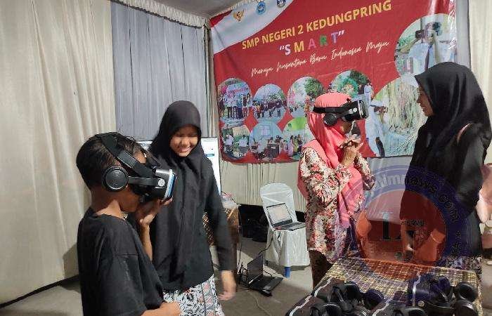 Sedangkan untuk pembelajaran masa kini, SMP Negeri 2 Kedungpring mensimulasikan pemanfaatan Virtual Reality (VR) dan Augmented Reality (AR) dalam proses pembelajaran. Tampak para pengunjung penasaran dan mencoba perangkat VR dan AR secara bergantian.