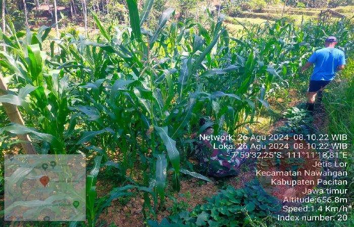 PACITAN lintasjatimnews – Mendukung kegiatan ketahanan pangan di wilayah, Serda Supriyanto Babinsa Koramil 0801/05 Nawangan Kodim 0801/Pacitan melaksanakan pendampingan Hanpangan berupa Penanaman dan pemeliharaan tanaman Jagung bersama Bapak Sukarni dari Poktan Bina Tani di wilayah binaan Desa Nawangan Kecamatan Nawangan Kabupaten Pacitan. Senin (26/08/2024).