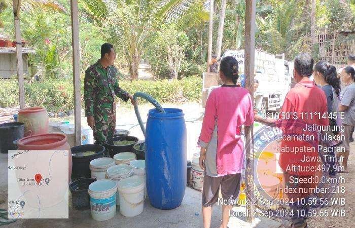 PACITAN lintasjatimnews – Kali ini penanganan dampak musim kemarau di berbagai wilayah khususnya yang ada di wilayah Kabupaten Pacitan, saat ini masih menjadi prioritas utama, baik dari pemerintah daerah, TNI, Polri maupun pihak terkait untuk memberikan bantuan berupa pendistribusian air bersih.