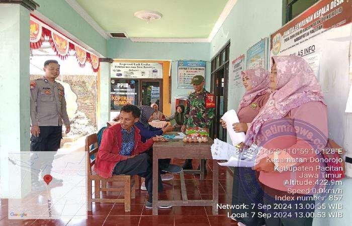 PACITAN lintasjatimnews – Dalam upaya peningkatan ketahanan pangan nasional dan penanganan resiko stunting. Babinsa Koramil 0801/11 Donorojo Kodim 0801/Pacitan, Sertu Arief melaksanakan pendampingan penyaluran bantuan sosial berupa bahan pangan bagi keluarga resiko stunting (KRS) di Balai Desa Donorojo Kecamatan Donorojo Kabupaten Pacitan. Sabtu (07/09/2024).