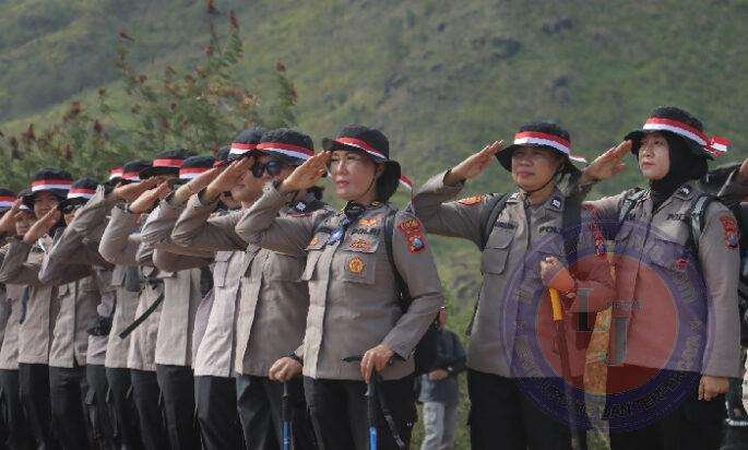Diatas puncak, Polwan Polres Mojokerto melaksanakan pengibaran bendera Merah Putih.