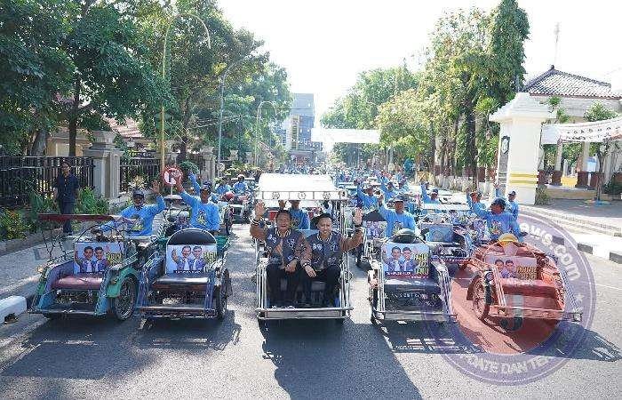 Usai orasi dukungan kepada pasangan Yes-Dirham, Paguyuban Becak Lamongan ini mengajak keliling Yuhronur Efendi dan Dirham Akbar Aksara naik becak keliling kota Lamongan