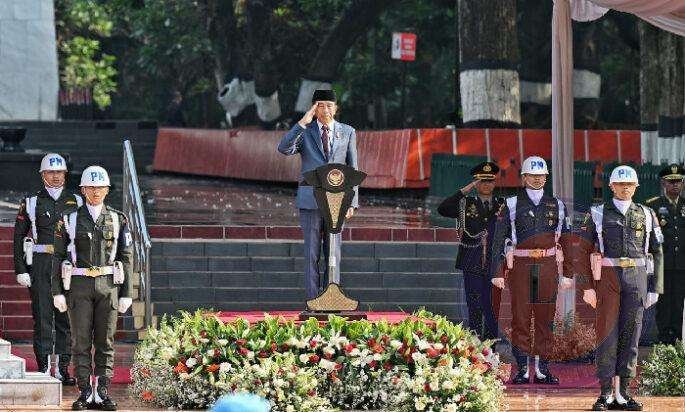 “Untuk mengenang jasa para pahlawan dan pejuang-pejuang bangsa utamanya pahlawan revolusi, mengheningkan cipta dimulai,” ucap Presiden selaku Inspektur Upacara.