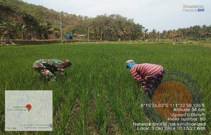 Babinsa Koramil 0801/09 Sudimoro Bantu Petani Lakukan Penyiangan Tanaman Padi