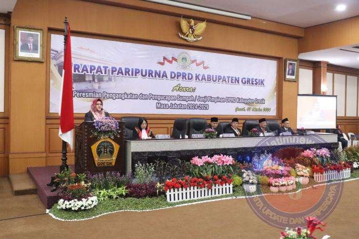 GRESIK lintasjatimnews.com – Dewan Perwakilan Rakyat Daerah (DPRD) Kabupaten Gresik hari ini, Senin (07/10), menyelenggarakan Rapat Paripurna Peresmian Pengangkatan Pengucapan Sumpah/Janji Pimpinan DPRD Kabupaten Gresik Masa Jabatan 2024-2029.