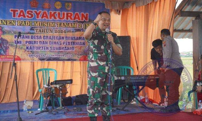 Sementara itu Dandim 0726/Sukoharjo Letkol Czi Slamet Riyadi, S.E (Dandim 0726/Skh) dan AKBP Sigit, S.I.K, M.H (Kapolres Sukoharjo) dalam sambutannya mengucapkan terima kasih kepada Pak Kades Grejegan dan para petani di Ds. Grajegan yang telah mengundang Dandim dan Kapolres dalam rangka Tasyakuran Panen Raya dengan tema Panen Bersama Sinergitas.