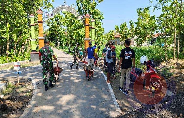 “Ayo Pak, semangat! Kita kerjakan bersama-sama,” seru Danramil, sambil ikut mendorong angkong yang mengangkut adukan semen. “Gotong royong ini bukti kekompakan kita, untuk kebaikan bersama.” Ujarnya.