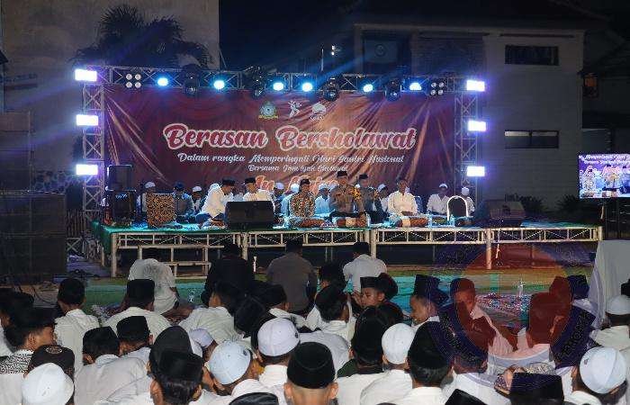 BANYUWANGI lintasjatimnews – Kapolresta Banyuwangi Kombes Pol Rama Samtama Putra,SI.K., M. Si,, M.H bersama sejumlah Pejabat Utama (PJU) Polresta Banyuwangi dan Kapolsek Muncar menghadiri Berasan Bersholawat di Pondok Pesantren Mambaul Ulum Muncar Banyuwangi.Selasa (22/10/2024).