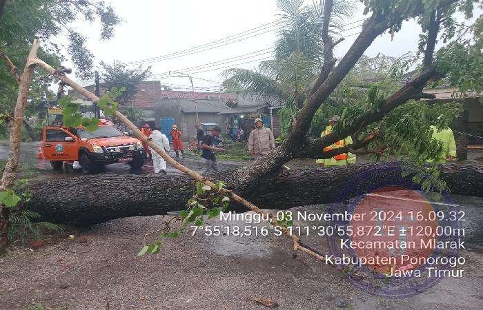 Diperkirakan akibat hujan dan angin kencang tersebut mengakibatkan salah satu pohon trembesi yang tumbuh di tepi jalan Desa Mlarak yang menghubungkan jalan Desa Jabung dan Desa Mlarak tumbang menghalangi jalan yang mana hal tersebut langsung dimonitor oleh Piket Koramil Tipe B 0802/15 Mlarak berkat laporan warga.