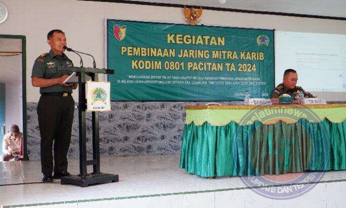 PACITAN lintasjatimnews – Kali ini Dengan mengusung tema, “Mewujudkan Binter TNI AD Yang Adaktif, Melalui Kegiatan Pembinaan Jaring Mitra Karib di Wilayah Guna Mengoptimalkan Deteksi Dini, Cegah Dini, Temu Cepat dan Lapor Cepat”, Kodim 0801/Pacitan melaksanakan kegiatan pembinaan jaring Mitra Karib TA 2024, bertempat di aula kopral Sigit Makodim 0801/Pacitan, Jl. Letjen Suprapto No.42, Barean, Desa/Kelurahan Sidoharjo, Kecamatan/Kota Pacitan Selasa (05/11/2024).