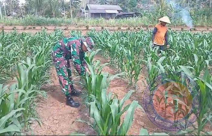 Tingkatkan Hanpangan, Babinsa Koramil 0801/10 Punung Bantu Basmi Hama Ulat pada Tanaman Jagung