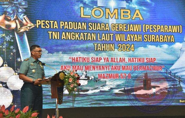 SURABAYA lintasjatimnews – Komandan Puslatdiksarmil (Danpuslatdiksarmil) Kodiklatal Kolonel Laut (P) Irwan S.P. Siagian mewakili Komandan Kodiklatal (Dankodiklatal) Letjen TNI Marinir Nur Alamsyah membuka secara resmi Lomba kegiatan Pesta Paduan Suara Gerejawi (Pesparawi) TNI Angkatan Laut (TNI AL) Wilayah Surabaya, bertempat di Gedung Maspardi AAL, Bumimoro Surabaya. Selasa, (26/11/2024).