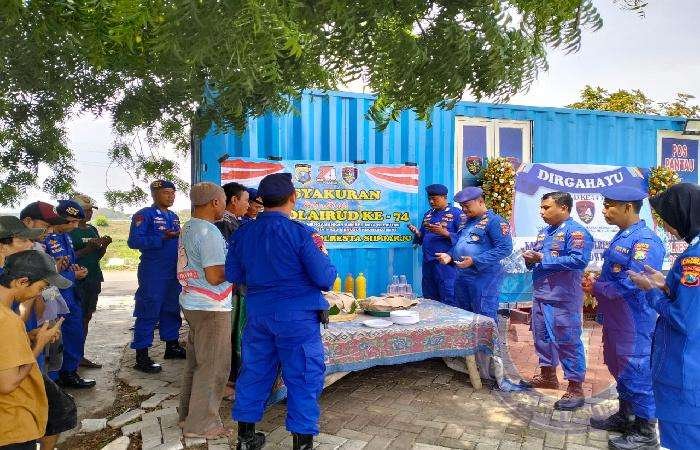 SIDOARJO lintasjatimnews – Polresta Sidoarjo Polda Jatim melalui Satuan Polairud (Polisi Perairanndan Udara) menggelar tasyakuran HUT ke-74 Polairud bersama nelayan di Pos Pantau Dermaga Sungai Tlocor, Jabon, Sidoarjo.