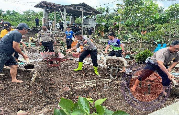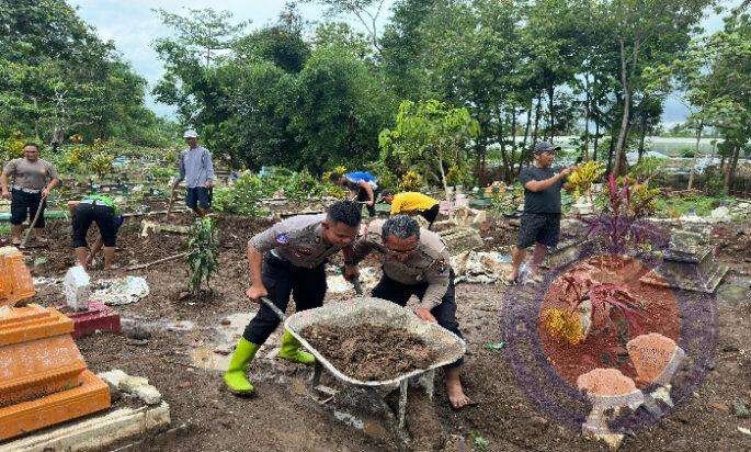 Anggota Satlantas Polres Blitar, dipimpin langsung oleh Kanit Turjagwali Iptu Celvin D. Samosir, S.Tr.K., turun tangan membantu proses pembersihan dan perbaikan makam di TPU desa tersebut.
