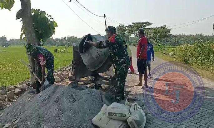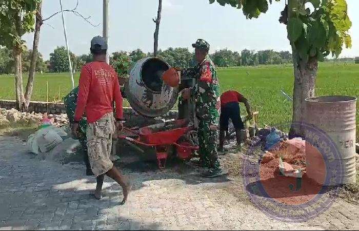 Melihat warga Desa Kwadungan sedang bergotong royong perbaikan jalan akses menuju ke area persawahan, Sertu Suprapto selaku Babinsa setempat pun langsung terjun membatu masyarakat.