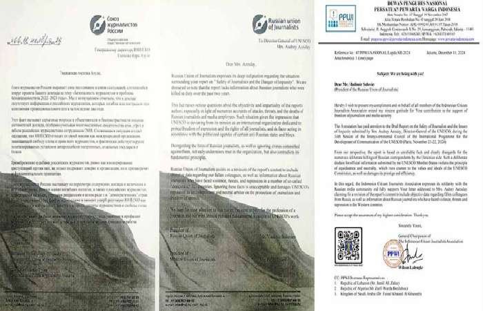 Dalam draft laporan UNESCO tentang Keselamatan Jurnalis dan Isu Impunitas Jurnalis yang disampaikan pada pertemuan Sesi Ke-34 Dewan Kerjasama Antar Pemerintahan dan Program Internasional tentang Pembangunan Komunikasi UNESCO di Paris pada tanggal 21-22 November 2024 lalu, lembaga tersebut terkesan diskriminatif dan kurang akurat dalam menyajikan data real terkait hambatan, pembatasan akses, penangkapan, penyiksaan, dan pembunuhan, yang dialami kalangan jurnalis, khususnya para jurnalis Rusia. Oleh sebab itu, sekali lagi saya mendesak agar Direktur Jenderal UNESCO, Ibu Audrey Azoulay, segera merevisi dan melengkapi draft laporannya, sebelum dipublikasikan pada tanggal 13 Desember 2024 mendatang, dengan mencantumkan data faktual tentang kondisi dan situasi yang dialami para wartawan Rusia saat melakukan peliputan di medan perang Rusia-Ukraina.
