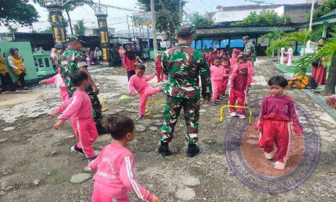 Peltu Mujiyar selaku Batuud Koramil 13/Kedunggalar bersama anggota menyambut kedatangan anak didik TK Perwanida dengan memberi sambutan yang baik dan ramah.