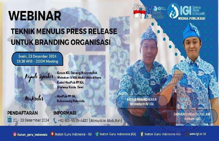 JAKARTA lintasjatimnews – Pengurus Pusat Ikatan Guru Indonesia (IGI) Bidang Media dan Publikasi menyelenggarakan Webinar Teknik Menulis Press Release Untuk Branding Organisasi. Format kegiatan diadakan secara Daring (dalam jaringan) atau online via zoom.