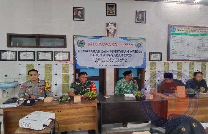 PACITAN lintasjatimnews – Serda Sujoko Babinsa Koramil 0801/03 Arjosari, menghadiri acara kegiatan MUSDES pemaparan dan penempatan APBDes tahun anggaran 2025 bertempat di Balai Desa Jatimalang kec. Arjosari Kab Pacitan. Kamis (26/12/2024)