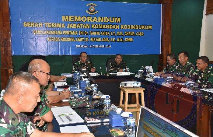 SURABAYA lintasjatimnews – Menjelang Serah Terima Jabatan (Sertijab), Komandan Kodikdukum (Dankodikdukum) Kodiklatal Laksma TNI Dr. Taufik Arief melaksanakan Memorandum kepada penggantinya yaitu Kolonel laut (T) Bisyar Adib, bertempat di Ruang Rapat Mako Kodikdukum Kodiklatal, Bumimoro Surabaya. Selasa (31/12/2024).