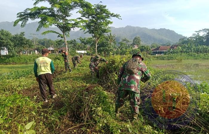 Berbekal alat sederhana seperti mesin pemotong rumput, sabit, dan cangkul, TNI dan warga bahu-membahu membersihkan semak belukar dan sampah yang menumpuk di sekitar embung. Pemandangan penuh semangat ini mencerminkan kekompakan dan kebersamaan dalam merawat lingkungan.
