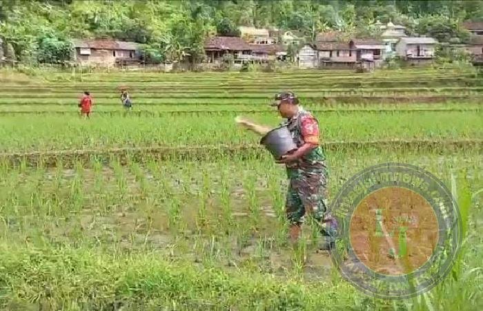 Babinsa Koramil 0801/04 Tegalombo Lakukan Pemupukan Lahan Padi
