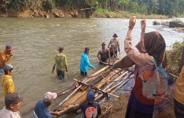 Mereka bahu-membahu bersama warga setempat untuk membantu para siswa dan siswi menyebrangi sungai dengan menggunakan getek bambu yang dirakit sebagai sarana penyebrangan sementara.