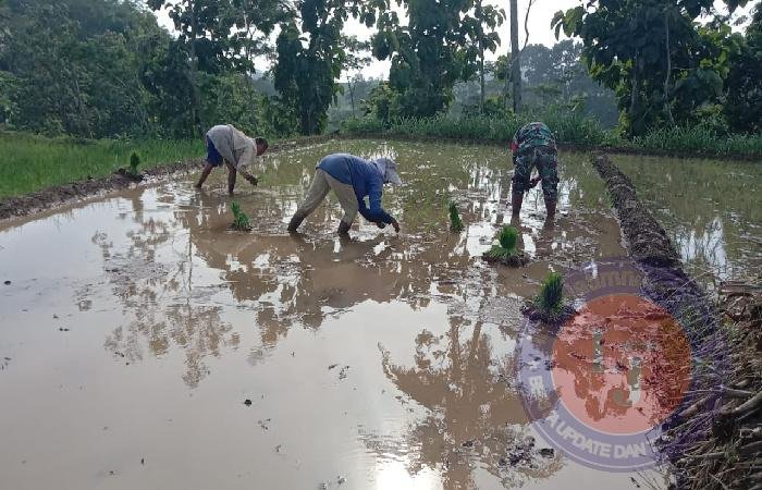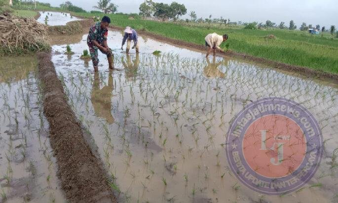 Seperti halnya yang dilakukan Babinsa Koramil 07/Ngrambe Serda Heru Purwanto melaksanakan kegiatan pendampingan dan membantu petani yang sedang menanam padi, Minggu (19/01/2025).
