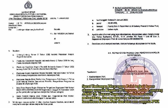 JAKARTA lintasjatimnews – Propam Polri mengundang Ketua Umum Persatuan Pewarta Warga Indonesia (Ketum PPWI), Wilson Lalengke, dalam rangka klarifikasi terkait laporannya tentang Kapolres Pringsewu yang sudah melecehkan profesi jurnalis serta mengancam mengusir wartawan dari wilayah kerjanya. Sebagaimana diberitakan sebelumnya, perilaku buruk oknum Kapolres Pringsewu, AKBP M. Yunnus Saputra, dilaporkan oleh Ketum PPWI itu ke Divisi Propam Polri pada 18 November 2024 lalu.(20/1/25).
