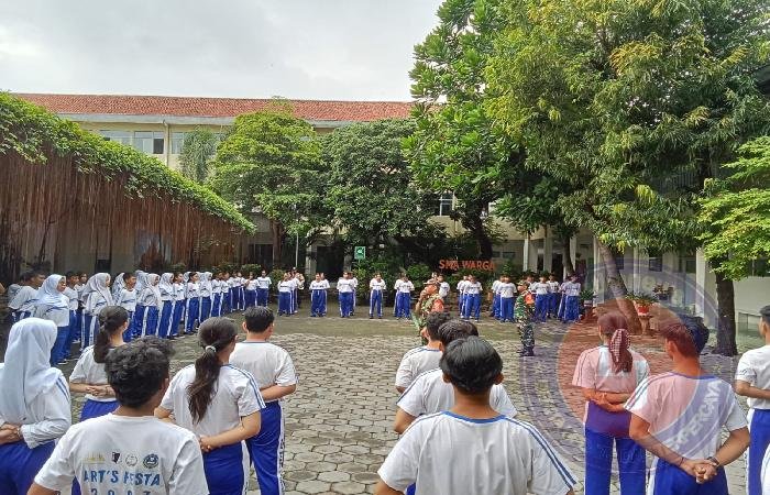 “Dalam memberikan pelatihan Peraturan Baris Berbaris (PBB) kepada siswa siswi SMA WARGA, kami bersama Bhabinkamtibmas memberikan arahan kepada para Murid di halaman sekolah SMA WARGA.” terangnya.