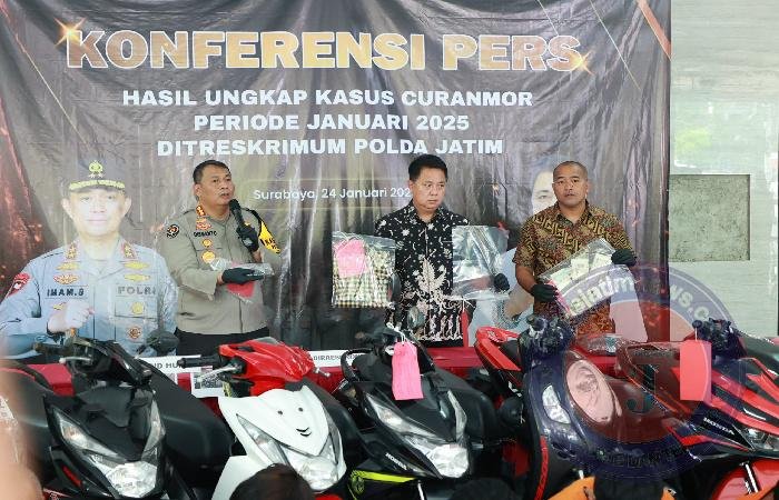 SURABAYA lintasjatimnews – Polda Jawa Timur (Jatim) dan seluruh jajaran satuan wilayah (Polres/ta/tabes) berhasil mengungkap jaringan pencurian kendaraan bermotor (curanmor) sebanyak 157 kasus sepanjang Januari 2025.