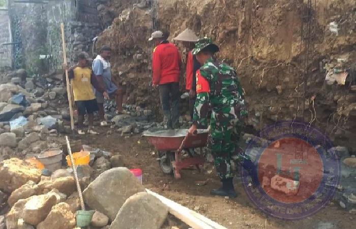 “Kami bersama warga bergotong-royong membangun tanggul penahan jalan untuk memperkuat struktur tanah agar tidak longsor. Ini adalah langkah penting untuk melindungi jalan desa sebagai jalur utama masyarakat,” kata Serda Adista Rifai dengan penuh semangat.
