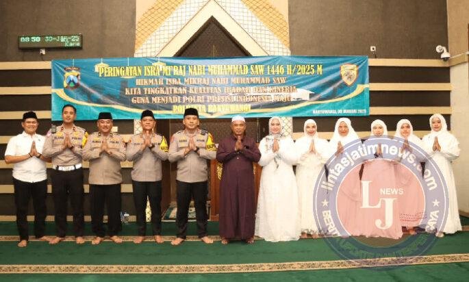 BANYUWANGI lintasjatimnews – Polresta Banyuwangi menggelar peringatan Isra Miraj Nabi Muhammad SAW tahun 1446 H/2025 M di Masjid Roudlotul Jannah Polresta Banyuwangi. Dengan tema “Himkah Maulid Nabi Muhammad SAW, Kita Tingkatkan Kualitas Ibadah dan Kinerja Guna Menjadi Polri Presisi Indonesia Maju”, Kamis (30/01/2025).