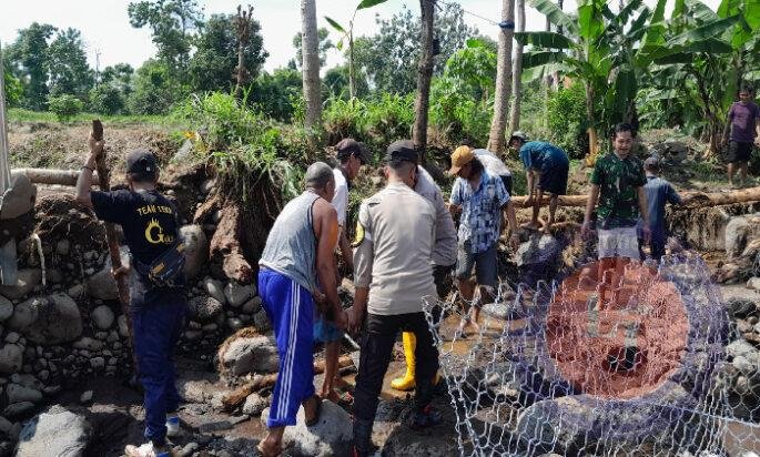 SITUBONDO lintasjatimnews – Personel Polsek Jatibanteng Polres Situbondo bersama masyarakat melaksanakan kerja bakti membersihkan kayu dan material sisa banjir serta memasang bronjong di Jembatan Dusun Dauh Desa Jatibanteng.