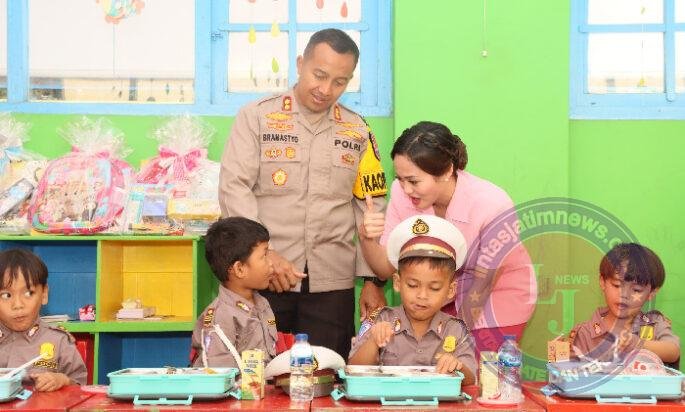 KOTA KEDIRI lintasjatimnews – Suasana ceria terpancar dari wajah anak-anak TK Kemala Bhayangkari 42 Kota Kediri saat mereka menyambut kedatangan Kapolres Kediri Kota AKBP Bramastyo Priaji S.H,S.IK, M.Si bersama Ketua Bhayangkari Cabang Kediri Kota Ny. Ratih Bramastyo Priaji , serta jajaran pejabat utama Polres Kediri kota dan pengurus Bhayangkari.