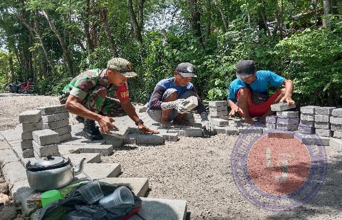 Saat di lokasi, terlihat jelas kekompakan gotong-royong saling bantu-membantu antara masyarakat dan Babinsa bersama dengan warga setempat dalam pemasangan paving jalan.
