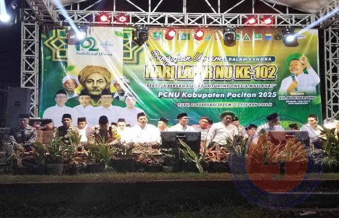 PACITAN lintasjatimnews – Kali ini Dandim 0801/Pacitan yang di wakili Pasiops Dim 0801/Pacitan Kapten Inf Agus Nuriyadi hadiri Pengajian Umum dalam rangka Peringatan Hari Lahir ke 102 Nahdlatul Ulama Tahun 2025 dengan tema “Bekerja sama umat untuk Indonesia Maslahat”, yang bertempat di stadion Citra Mandiri Jl. Arjosari – Nawangan, Dsn. Krajan, Desa Arjosari, Kec Arjosari, Kab.Pacitan.Rabu(12/02/2025)malam.