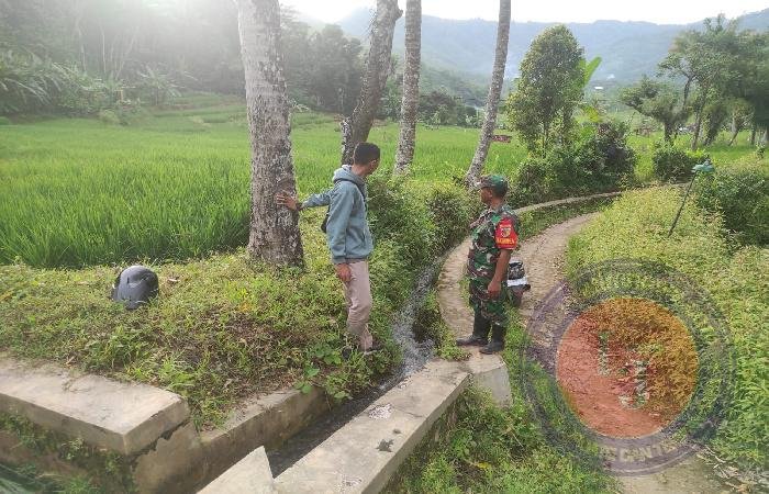 Terlihat Sertu Purwanto bersama pemilik lahan, Bapak didik sedang mengecek dan membersihkan saluran irigasi yang dipenuhi rumput guna mengupayakan normalisasi saluran irigasi secara manual agar memperlancar aliran air ke persawahan warga.