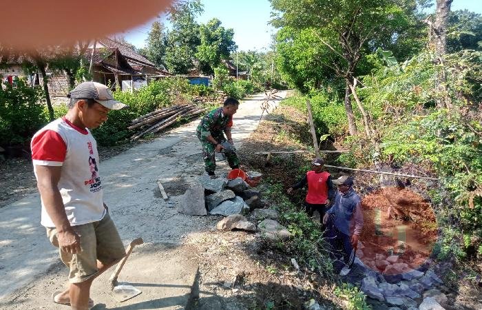 Kerja bakti ini melibatkan berbagai elemen masyarakat, mulai dari perangkat desa hingga pemuda setempat. Serda Suharjito dengan sigap turun langsung membantu proses pembangunan, mulai dari mengangkut material hingga menata batu pondasi.