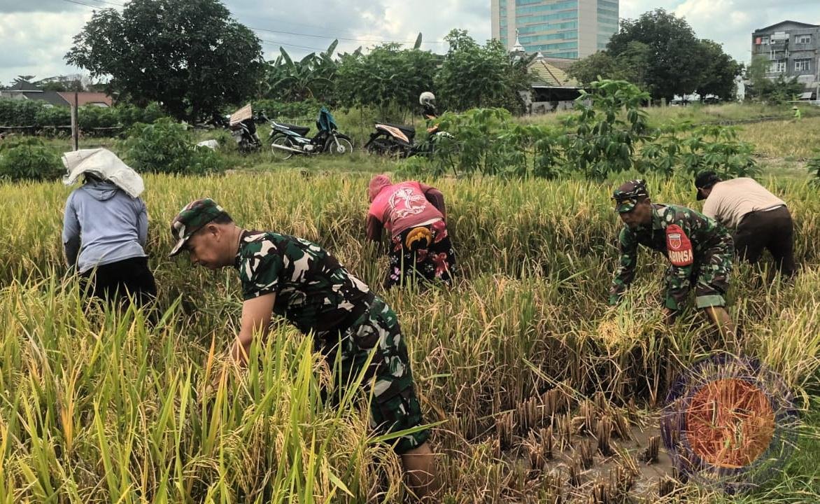 Sukseskan Ketahanan Pangan, Pasiter Kodim 0735/Surakarta Bersama Anggota Koramil 01/Laweyan, Bantu Petani Panen Padi